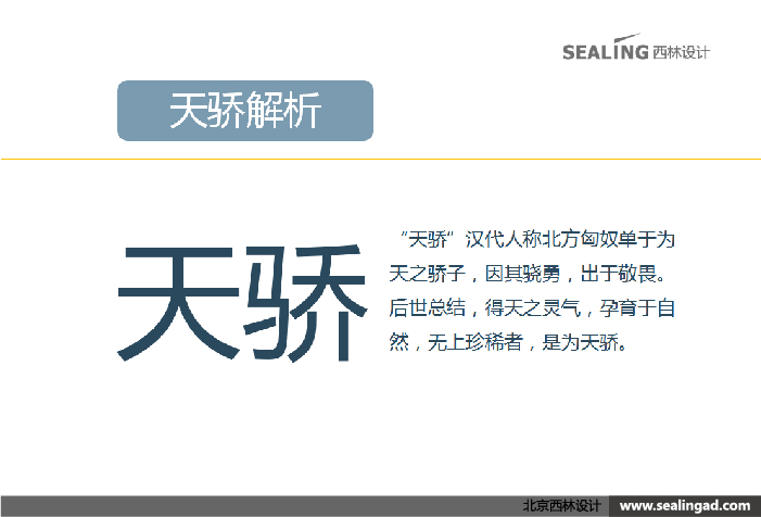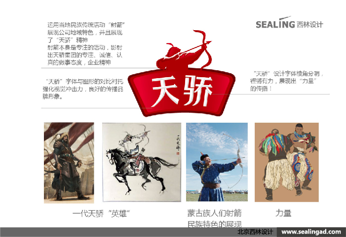 一代天驕“英雄”,運用當地民族傳統活動“射箭”展現公司地域特色,并且展現了“天驕”精神,射箭本身是專注的活動,影射出天驕集團的專注、誠信、認真的做事態(tài)度,企業(yè)精神。天驕設計字體棱角分明,鏗鏘有力,展現出“力量”的傳播。