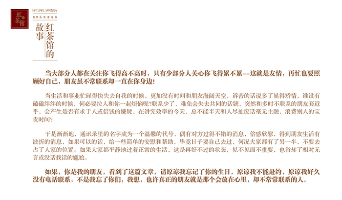 這就是《紅茶館》的由來,讓我們一起繼續(xù)編寫《紅茶館》的故事。自然而然想起你的自然泉團隊是一群有理想的年輕人。我們希望通過我們的所作所為,能喚起人與人之間的感情,能溫暖那些不曾常聯(lián)系的人。