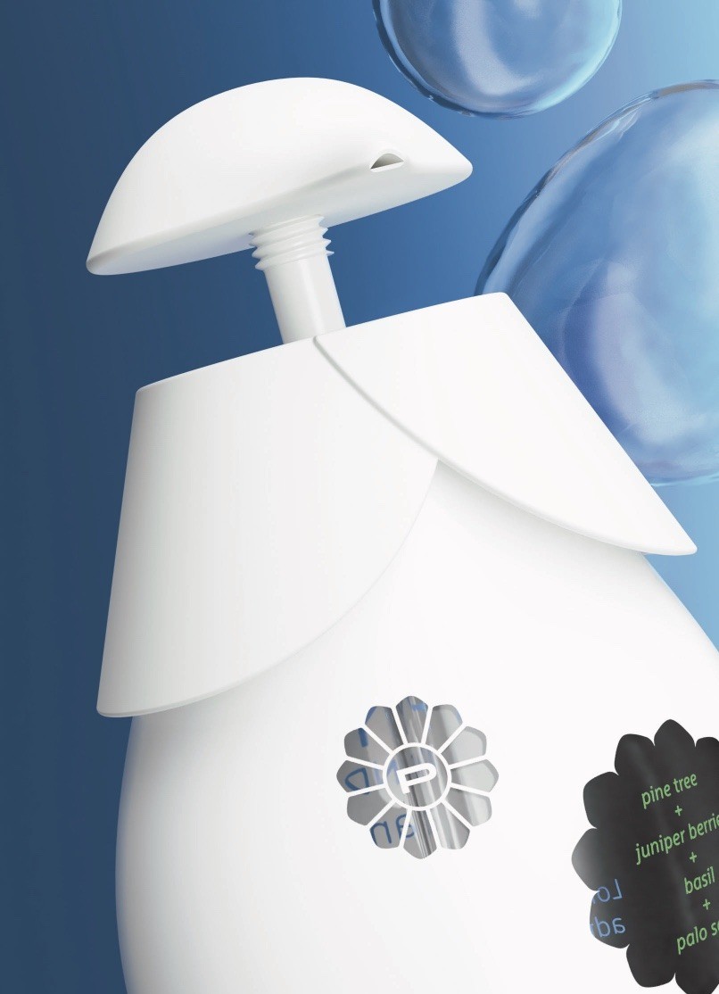 通過使用場景可以觀察到轉(zhuǎn)化為我的設(shè)計(jì)的松果的特性。每一瓶派恩洗手液都有一個(gè)“補(bǔ)充種子”,一個(gè)由雞蛋盒狀的再生紙制成的小袋,里面裝滿了粉末狀的洗手液。然后,用戶將粉末倒入瓶中,就像松果的鱗片將水輸送到莖部一樣,將粉末與水混合,在家中制作產(chǎn)品。這節(jié)省了運(yùn)輸重液體洗漱用品的成本和碳足跡。補(bǔ)充種子也可以單獨(dú)購買12粒種子的光盤,類似于派恩標(biāo)志。材料和形式創(chuàng)造了一個(gè)獨(dú)特和可持續(xù)的品牌機(jī)會(huì),因?yàn)榉N子可以用徽標(biāo)壓花,而不需要墨水打印,同時(shí)所需的法律信息可以包含在單個(gè)中央標(biāo)簽上。此外,光盤可堆疊,從而節(jié)省貨架空間。填充種子的整體設(shè)計(jì)在不同的變體中相似,只是顏色和標(biāo)簽設(shè)計(jì)不同。另一個(gè)常見的部件是蓋和泵系統(tǒng)。形狀相似,表面處理和顏色略有變化,降低了模具成本,因?yàn)橥荒>呖膳c不同的顏料顆粒重復(fù)使用。設(shè)計(jì)語言應(yīng)該散發(fā)出保護(hù)的感覺,瓶蓋幾乎包裹著瓶子,因?yàn)樗潭ㄔ谄款i上。將泵固定在瓶子上的螺旋運(yùn)動(dòng)也模仿了松果的分形結(jié)構(gòu),從上到下螺旋運(yùn)動(dòng)。致動(dòng)器為圓頂形,除了確保符合人體工程學(xué)的設(shè)計(jì)外,還將產(chǎn)品與競爭對(duì)手區(qū)分開來,因?yàn)樵谙词职b設(shè)計(jì)中,分配器泵作為一個(gè)獨(dú)特的功能經(jīng)常被忽略。每種派恩洗手液有兩種尺寸:350毫升和700毫升