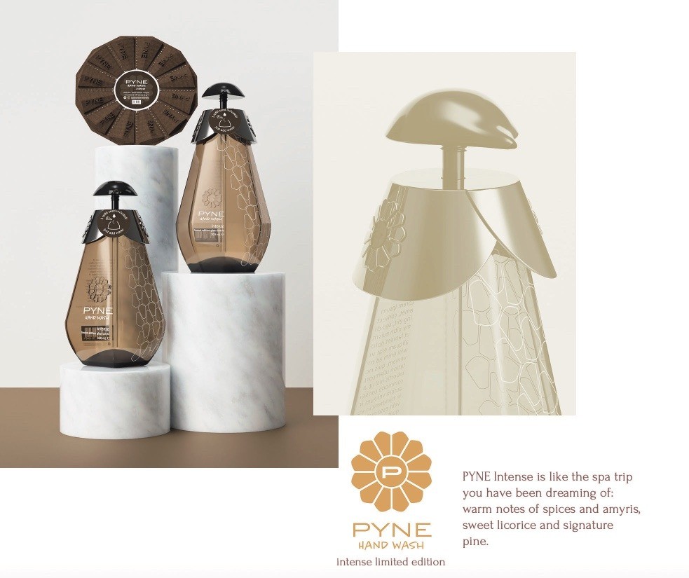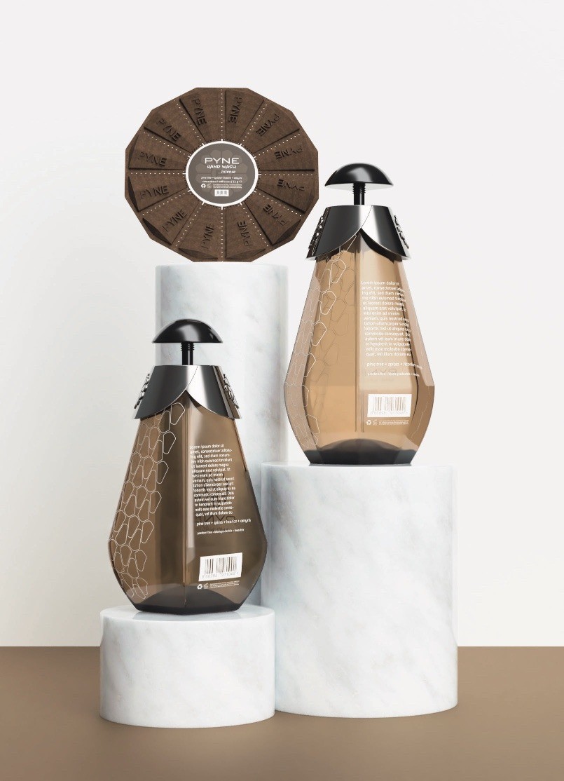 我的概念是從創(chuàng)建一個(gè)品牌開始的。我知道我會(huì)參考松果的設(shè)計(jì),所以我希望整個(gè)品牌都與松樹有關(guān)。在我的仿生書中,用審美選擇暗示主題是可以的,只要它是為了建立品牌的背景,并且一切都與作為最終產(chǎn)品呈現(xiàn)的具有凝聚力的故事的消費(fèi)者相關(guān)。我為PYNE洗手液產(chǎn)品線提供的三種變體制作了三種香水配置文件。三者都以松樹作為共同的音符,創(chuàng)造了一致的嗅覺品牌標(biāo)識(shí)。派恩洗手液是原版的主要變體;它有一個(gè)標(biāo)志性的,泥土的,平衡的特點(diǎn)與廣藿香,松子,檀香木的額外注意。原作是一款即時(shí)經(jīng)典,給人一種優(yōu)雅的感覺。這些品質(zhì)也體現(xiàn)在包裝設(shè)計(jì)中:在長方形瓶身上有一個(gè)柔和的調(diào)色板,帶有米色和深綠色。派恩洗手液antibac有一個(gè)泡沫,脆,明亮的個(gè)性與杜松漿果,羅勒,和帕洛桑托作為補(bǔ)充說明??箟难嶙兎N讓人想起在溫暖的夏天喝杜松子酒補(bǔ)品,因?yàn)樗鼘⑿l(wèi)生與新鮮聯(lián)系在一起。瓶子的設(shè)計(jì)是球狀的,主要是白色,帶有藍(lán)色和綠色的色調(diào),窗戶可以窺視里面的洗手液。另一方面,PYNE hand Wash Intensive限量版則與之完全相反,添加了香料、甘草和苦杏仁,創(chuàng)造了一種美食家、深度和奢華的體驗(yàn)。這就像你夢(mèng)寐以求的水療之旅,裝在一個(gè)瓶子里,它有著多面的寶石般的形狀,由琥珀色的玻璃和白色印刷的圖形元素組成。