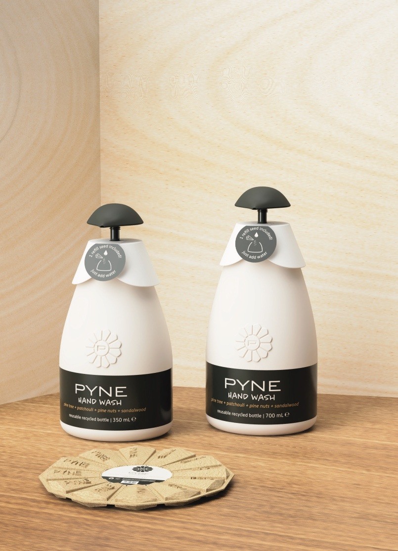 PYNE Hand Wash 是一個(gè)靈感來自松果的可再填充液體洗手液的概念品牌。該系列由三種香味組成:原創(chuàng)、抗菌和強(qiáng)烈限量版。每個(gè)配置文件都有不同的特征,但都基于松樹的味道,加上瓶子的形狀,整個(gè)體驗(yàn)是松果實(shí)體的翻譯。用戶通過將“再填充種子”開裂到瓶子中并與水混合來再填充瓶子。種子是由再生紙制成的豆莢,里面裝滿了粉末狀的產(chǎn)品,排列成 12 個(gè)環(huán),類似于松果的鱗片。