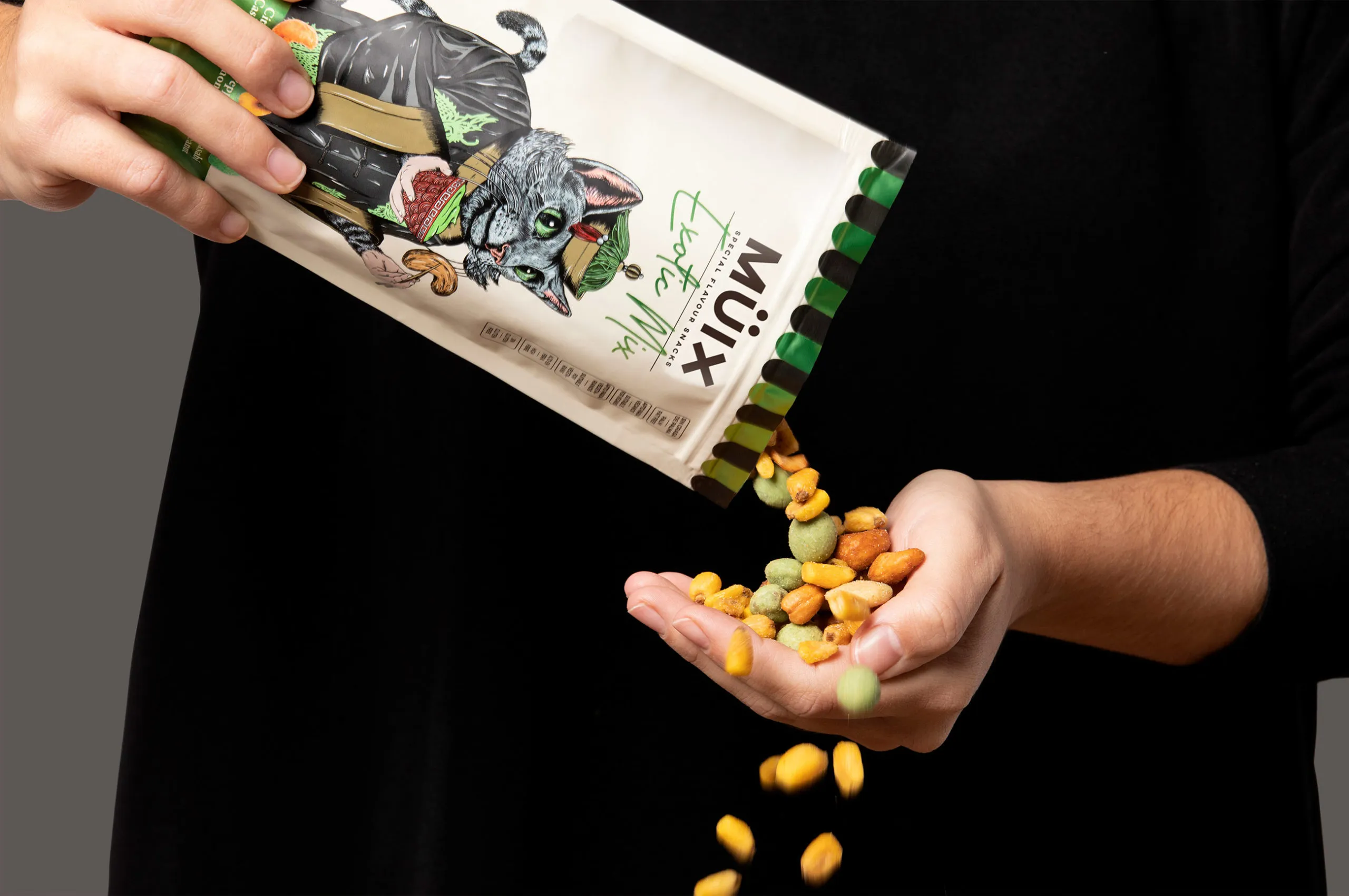 我們的包裝方案包括創(chuàng)建不同的插圖字符,以代表每種混合的特色風(fēng)味。農(nóng)民公雞為“鄉(xiāng)村混搭”,原汁原味的鄉(xiāng)村傳統(tǒng)風(fēng)味;“Yankee Mix”的棒球浣熊,美國風(fēng)味,混合了煙熏燒烤和辣椒的辛辣味道;童子軍熊的“Hunny Mix”,權(quán)力的特克斯墨西哥與甜蜜的蜂蜜,將帶我們回到童年;大師喚醒貓代表“異國情調(diào)的混合”,一次日本壽司酒吧之旅,混合了芥末、柑橘和胡椒;最后,這只獅子狗配上瑪麗·安托瓦內(nèi)特(Marie Antoinette)的“皇家混合口味”,這是一種甜而復(fù)雜的口味,將我們帶到法國競選運動的糖果店,散發(fā)著橘子、開心果和蜂蜜的芳香。