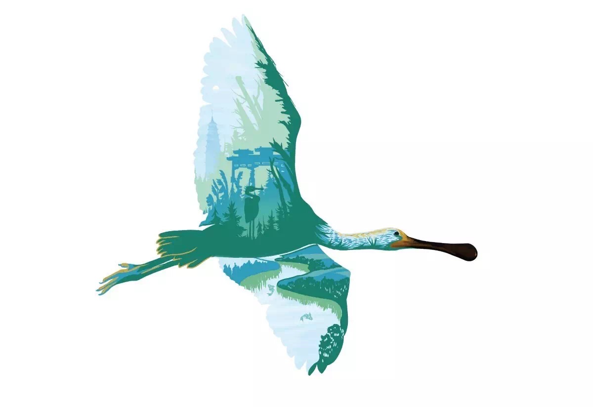 插畫創(chuàng)意,以白琵鷺為原型,將青山綠水、太湖等元素為描繪點(diǎn),繪制出生態(tài)、自然之感。通過畫面感的繪制,勾起人們對(duì)生態(tài)的保護(hù)情懷。