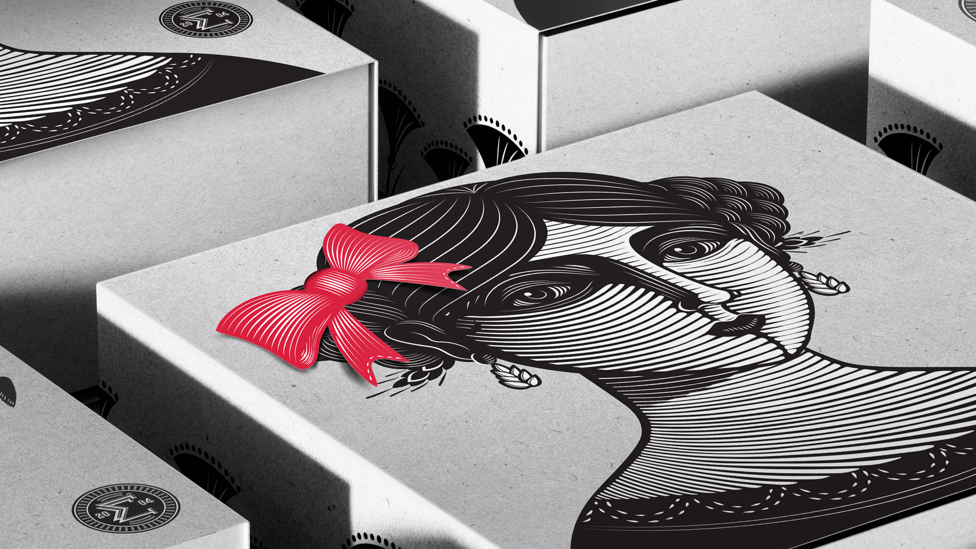 所有使用的蝴蝶結(jié)都是由回收材料制成的。蝴蝶結(jié)是從紙屑,從原始包裝時,削減生產(chǎn)。我們沒有把剩下的文件扔掉,而是把它們作為最后的點睛之筆再利用。包裝只使用黑色墨水和蝴蝶結(jié)紅色pantone顏色,從而減少了墨水的使用。