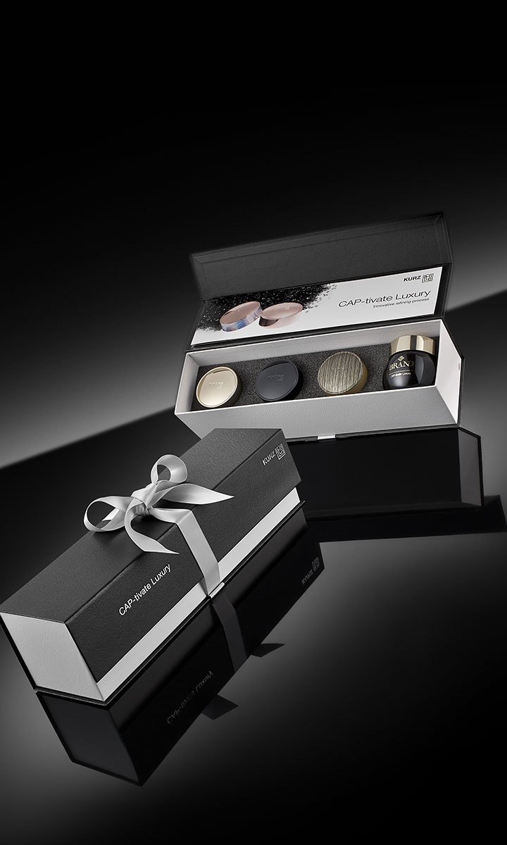 CAP-tivate 是一種提供多種替代方案的技術(shù)。它包括使用浮雕和淺浮雕進(jìn)行裝飾的可能性,以及能夠通過(guò)復(fù)雜設(shè)計(jì)裝飾甚至不規(guī)則表面的優(yōu)勢(shì),從而獲得具有出色美感和觸覺(jué)沖擊力的結(jié)果。 此外,它還允許用多個(gè)圖形裝飾瓶蓋。除了 IMD 頂部之外,還可以在稍后使用滾燙印進(jìn)行瓶蓋的外圍裝飾,并用不同類型的圖形和顏色。而且,在兩個(gè)不同時(shí)間制作的兩種裝飾不會(huì)有任何連接點(diǎn),由于臨時(shí)創(chuàng)建的工具,效果將是無(wú)縫的。