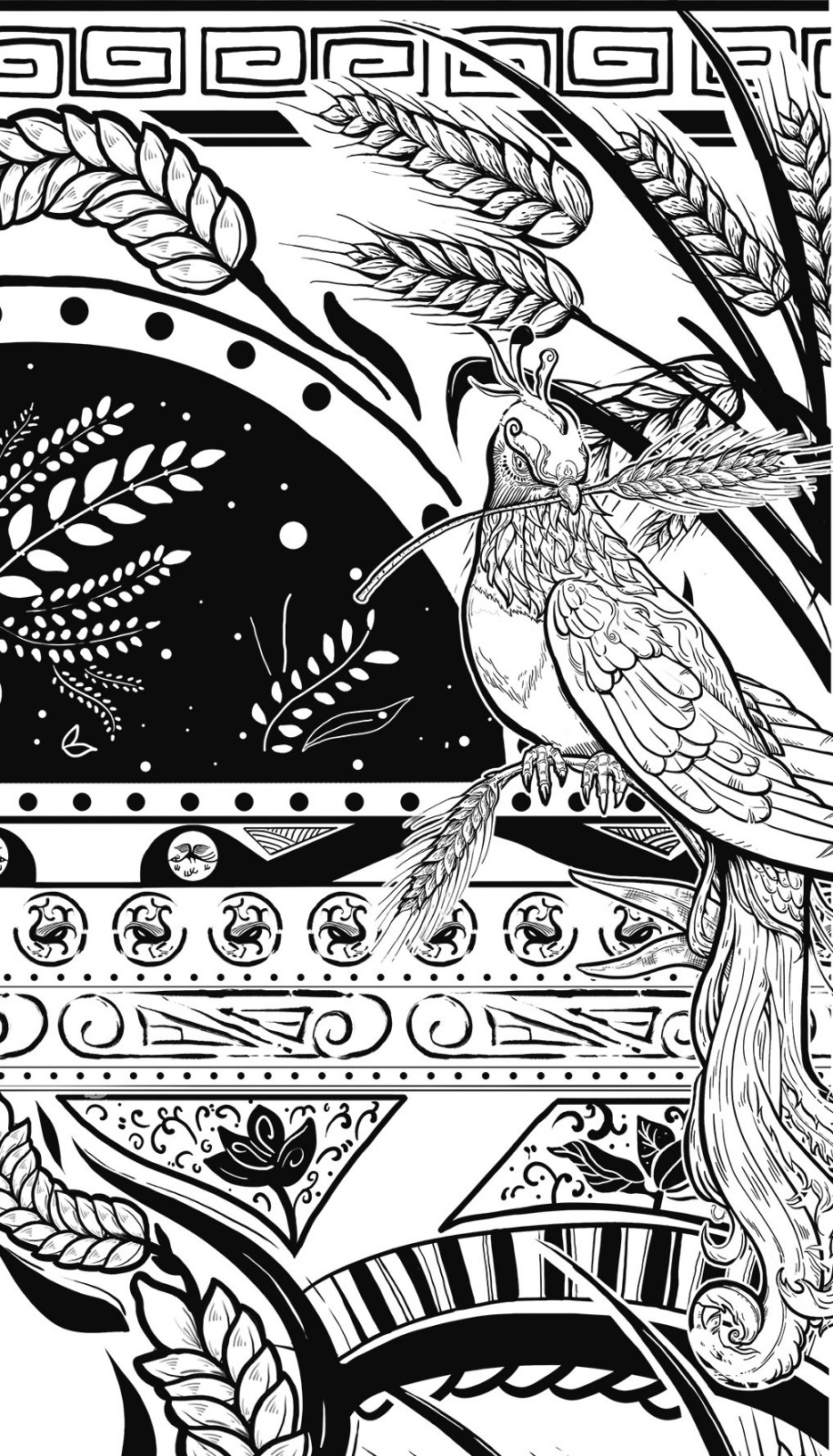 源自古老圖騰信仰的創(chuàng)意,甲骨文中“麥”源自“玄”其行如玄鳥(niǎo)展翅含穗而飛?!鹅`性甲骨》注義:“麥自天來(lái),自古即有‘天麥雨’之稱(chēng),寓意富足豐收歡悅。”