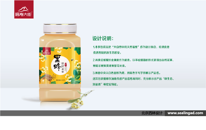 1.包裝把“大自然中的天然蜂蜜”作為設(shè)計概念,給消費者傳遞直觀的原生態(tài)感受。