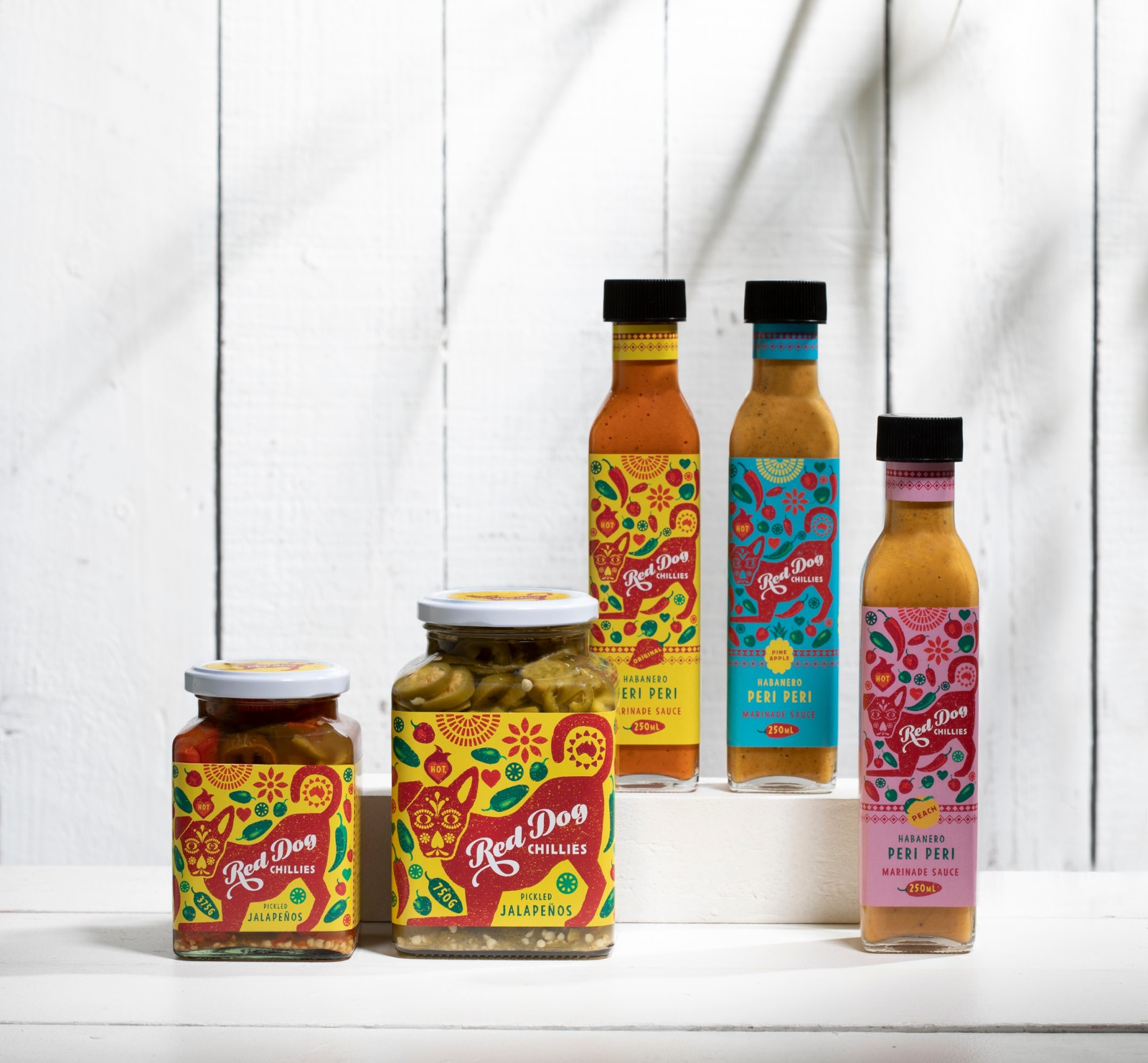 紅狗辣椒(Red Dog Chillies)需要重塑品牌,以展示其優(yōu)質(zhì)產(chǎn)品并吸引新的消費(fèi)者興趣。他們的老品牌并沒有傳達(dá)出店內(nèi)真實(shí),炙手可熱的美味。為了與墨西哥風(fēng)味的辣醬和墨西哥胡椒保持一致,我們采用了墨西哥的“街頭食品”主題。他們心愛的“紅狗”蜿蜒在農(nóng)場(chǎng)周圍,在標(biāo)簽上占據(jù)著中心位置。紅狗上裝飾著“死亡之日”口罩,標(biāo)簽上散布著許多品種的辣椒。該標(biāo)簽還有其他故事講述的圖像–太陽,這是辣椒成功生長(zhǎng)的關(guān)鍵因素,并且以圖形方式傳達(dá)這是澳大利亞的產(chǎn)品。墨西哥設(shè)計(jì)模式增加了墨西哥主題。醬汁范圍內(nèi)共有三種口味,每種口味都有不同的顏色。
