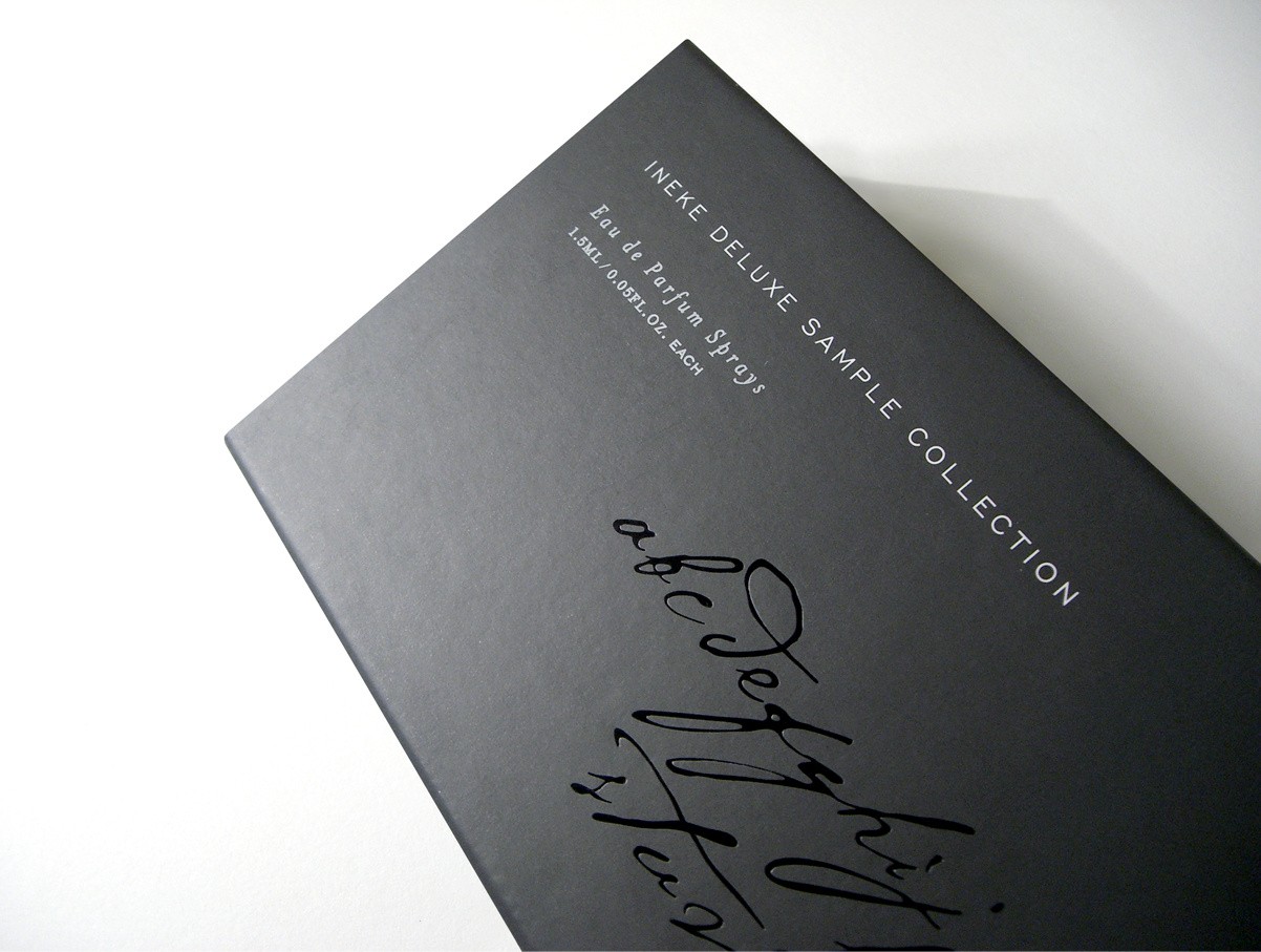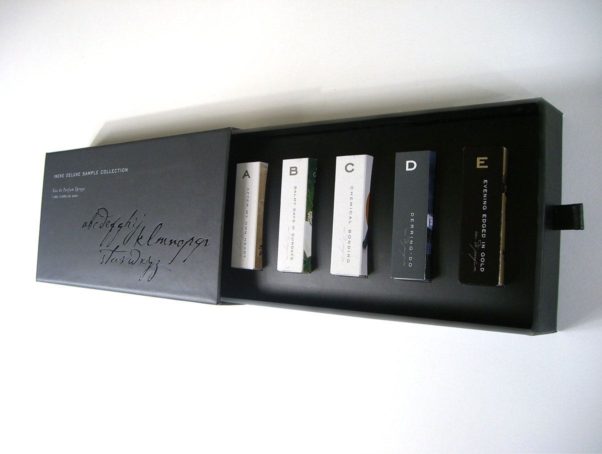 Ineke Deluxe Sample Collection通過高檔抽屜盒包裝展示了Ineke香水的微型版本。在每個(gè)采樣器中,小瓶都用柔軟的薄紙包裹著,并裝在(抽拉盒)火柴盒中。
