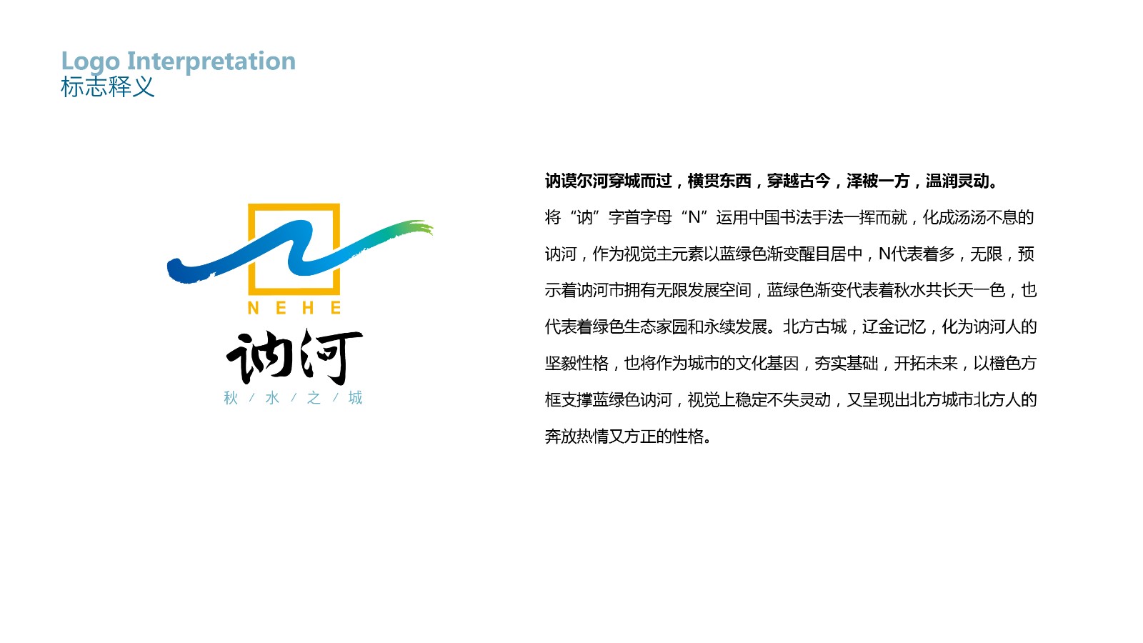 訥河城市品牌形象設計創(chuàng)意釋義:訥謨爾河穿越而過,橫貫東西,穿越古今,澤被一方,溫潤靈動。我們將“訥”字首字母[N]運用中國書法手法一揮而就,化成湯湯不息的訥河,作為視覺主元素以藍綠色漸變醒目居中,N代表著多,無限,預示著訥河擁有無限發(fā)展空間,藍綠色漸變代表著秋水共長天一色,也代表著綠色生態(tài)家園和永續(xù)發(fā)展。北方古城,遼金記憶,化為訥河人的堅毅性格,也將作為城市的文化基因,夯實基礎,開拓未來,以橙色方框支撐藍綠色訥河,視覺上穩(wěn)定不失靈動,又呈現(xiàn)出北方城市北方人的奔放熱情又方正的性格。