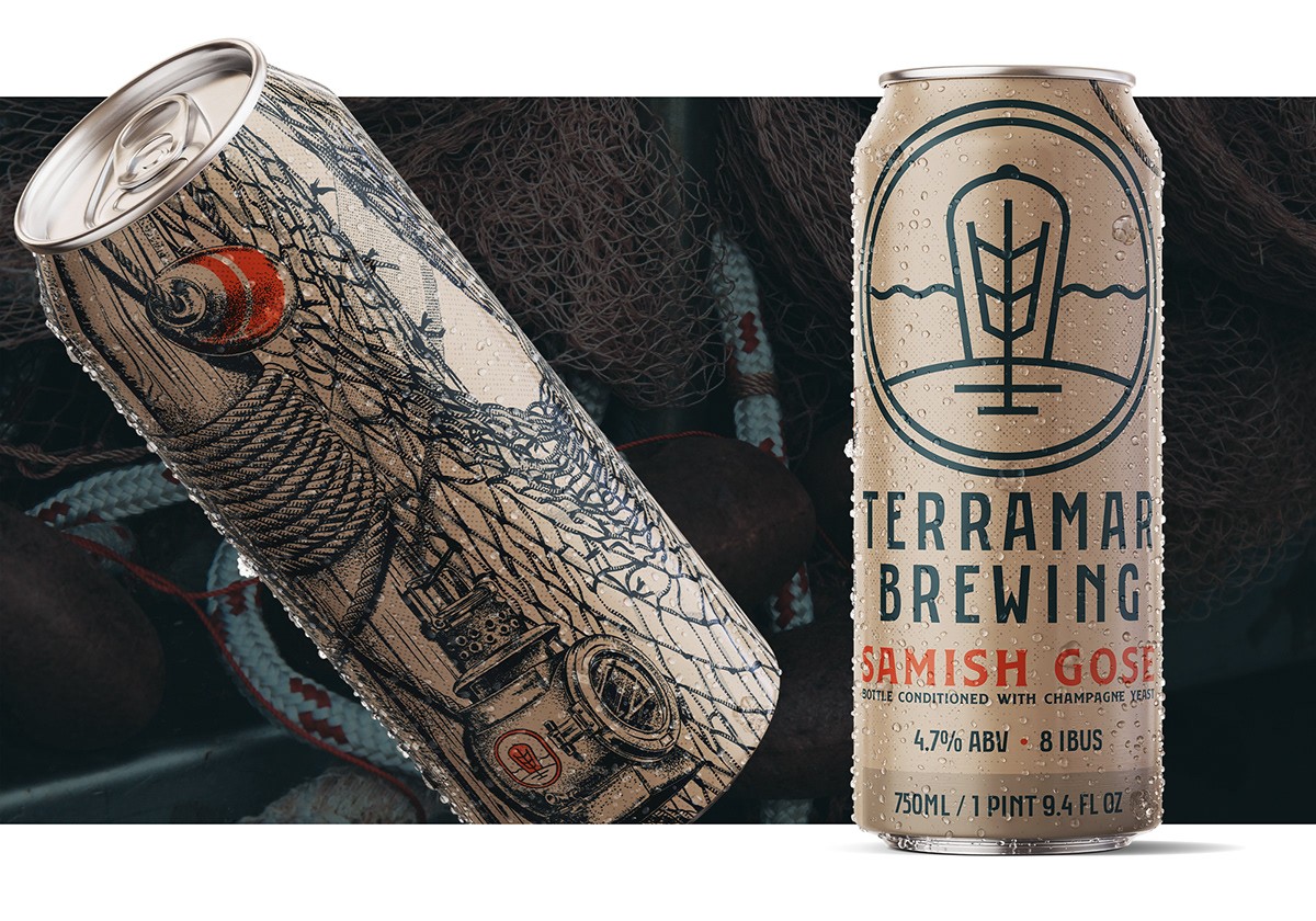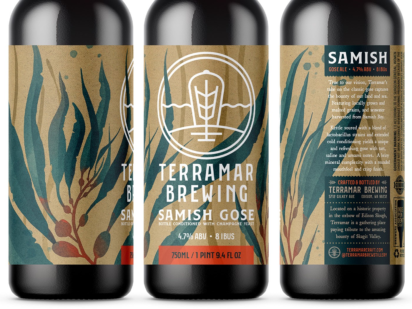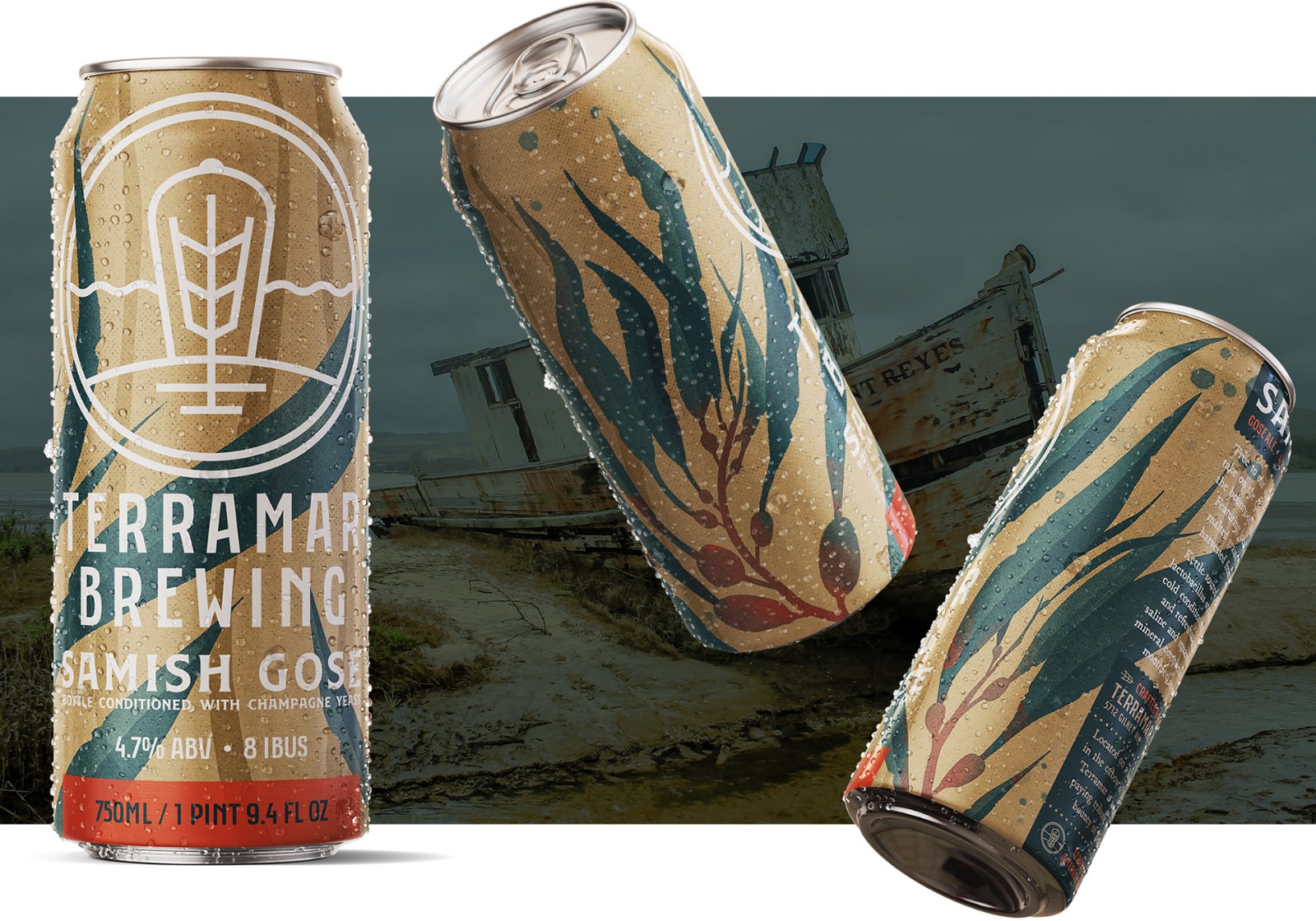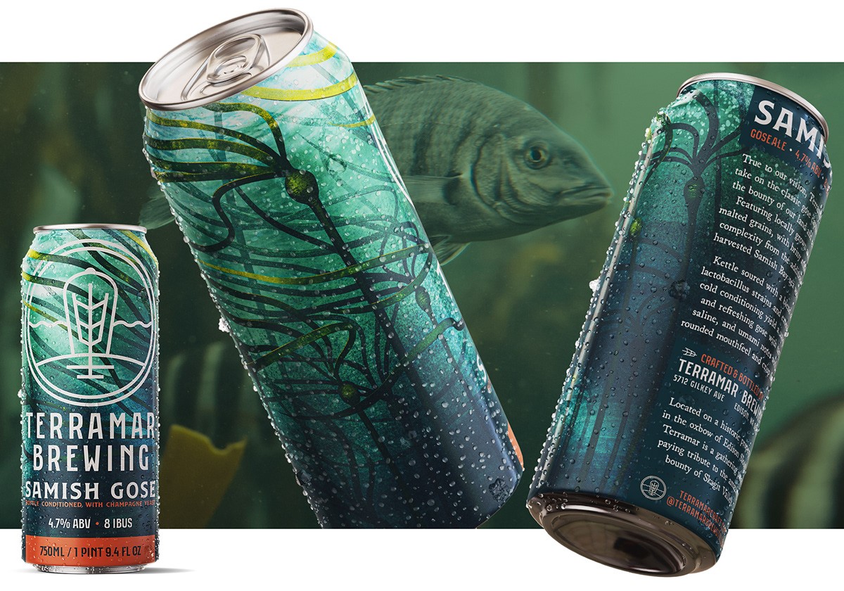 Terramar 的 Samish Gose,一個 750 毫升的瓶子,看看這些設計如何轉(zhuǎn)化為 16 盎司的罐子,以水彩風格的巨型海帶(sp. Macrocystis pyrifera)的繪畫效果圖為中心