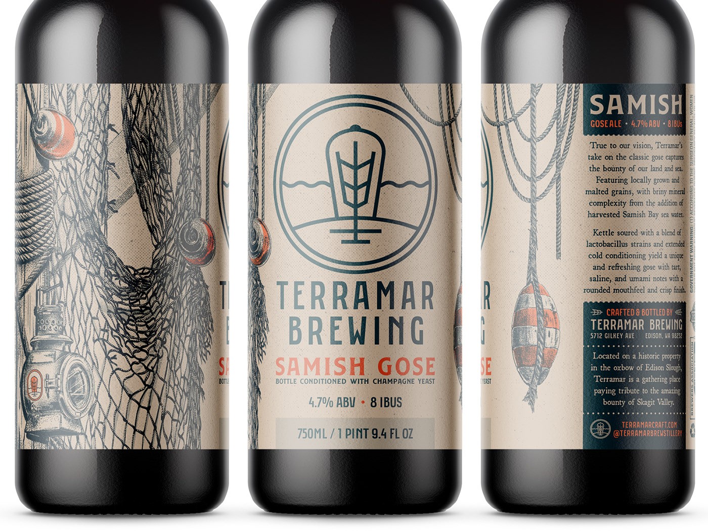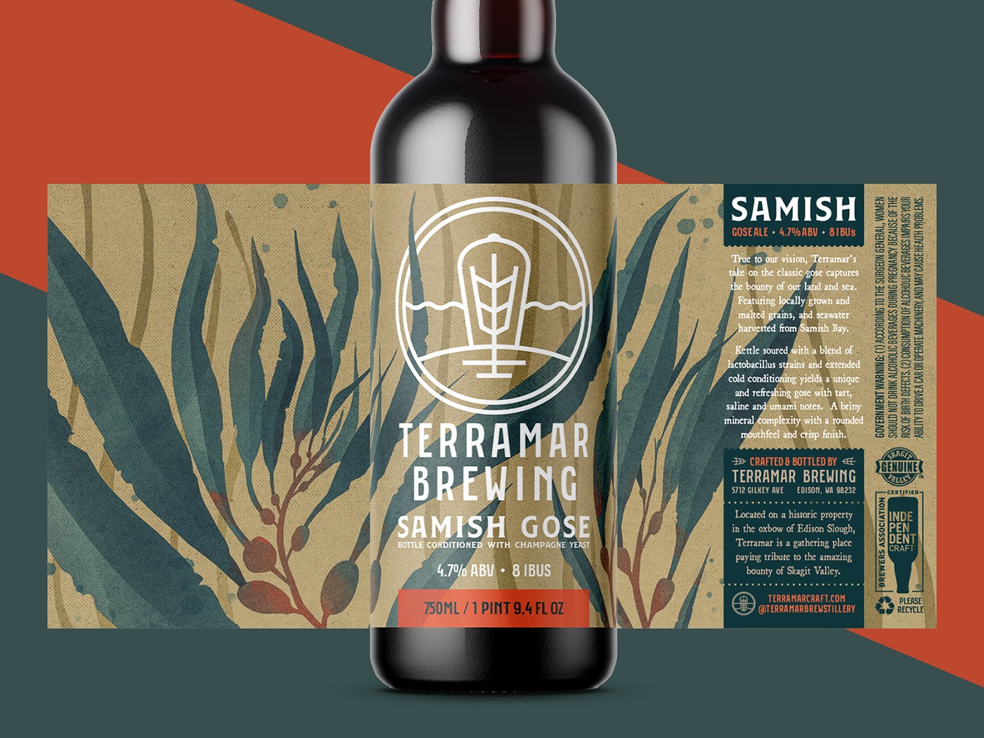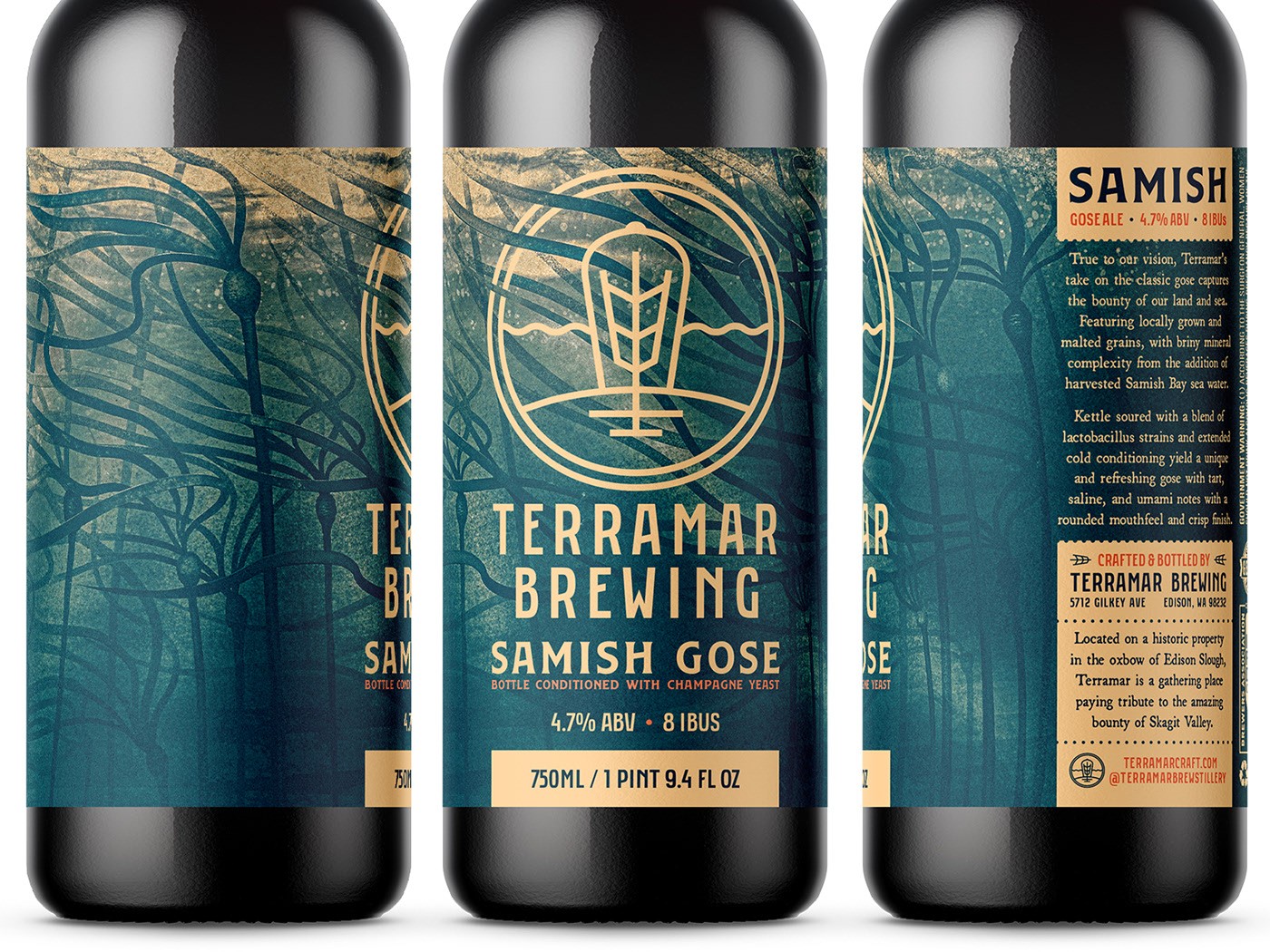 Terramar 的 Samish Gose,一個 750 毫升的瓶子,看看這些設計如何轉(zhuǎn)化為 16 盎司的罐子,以水彩風格的巨型海帶(sp. Macrocystis pyrifera)的繪畫效果圖為中心