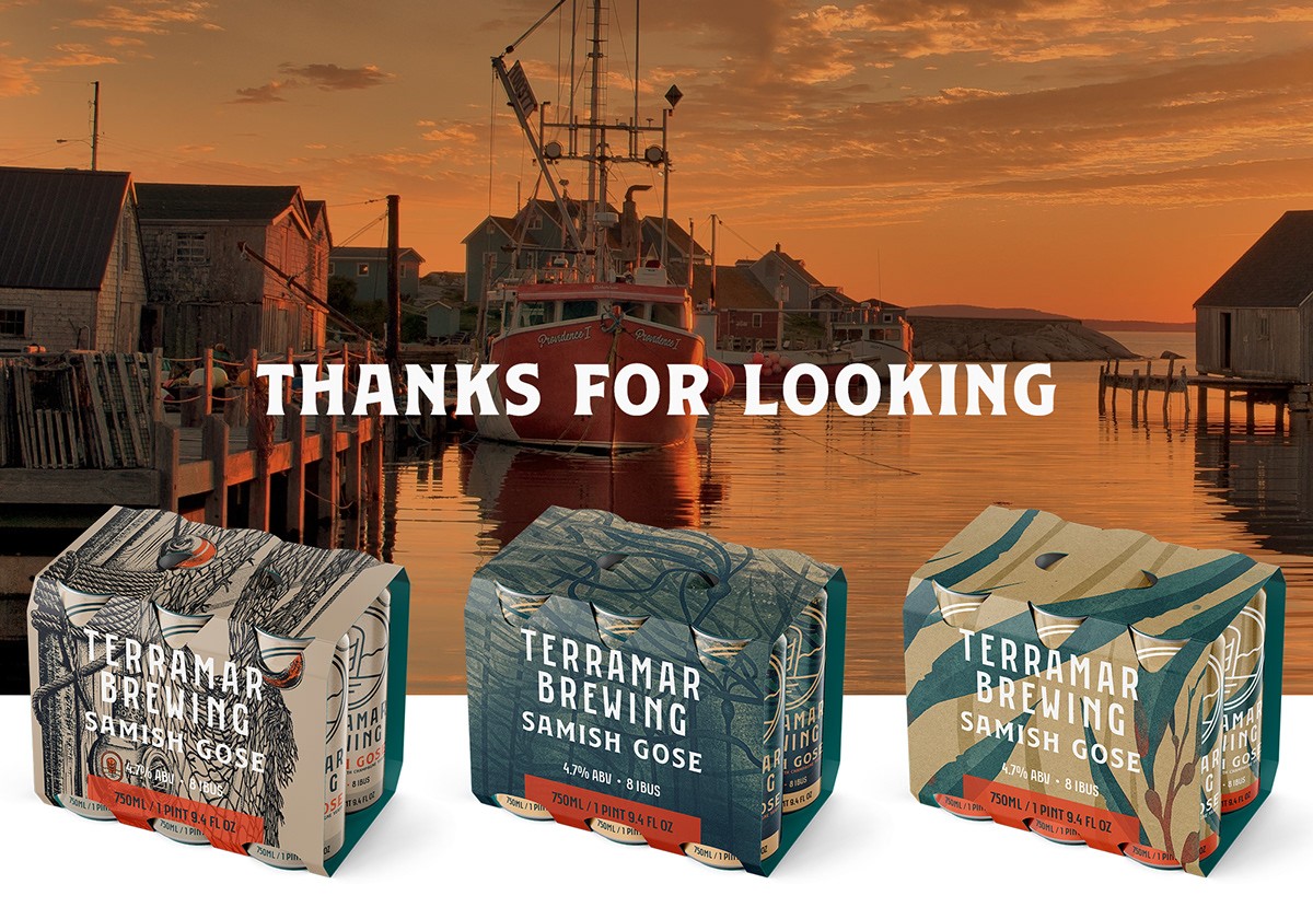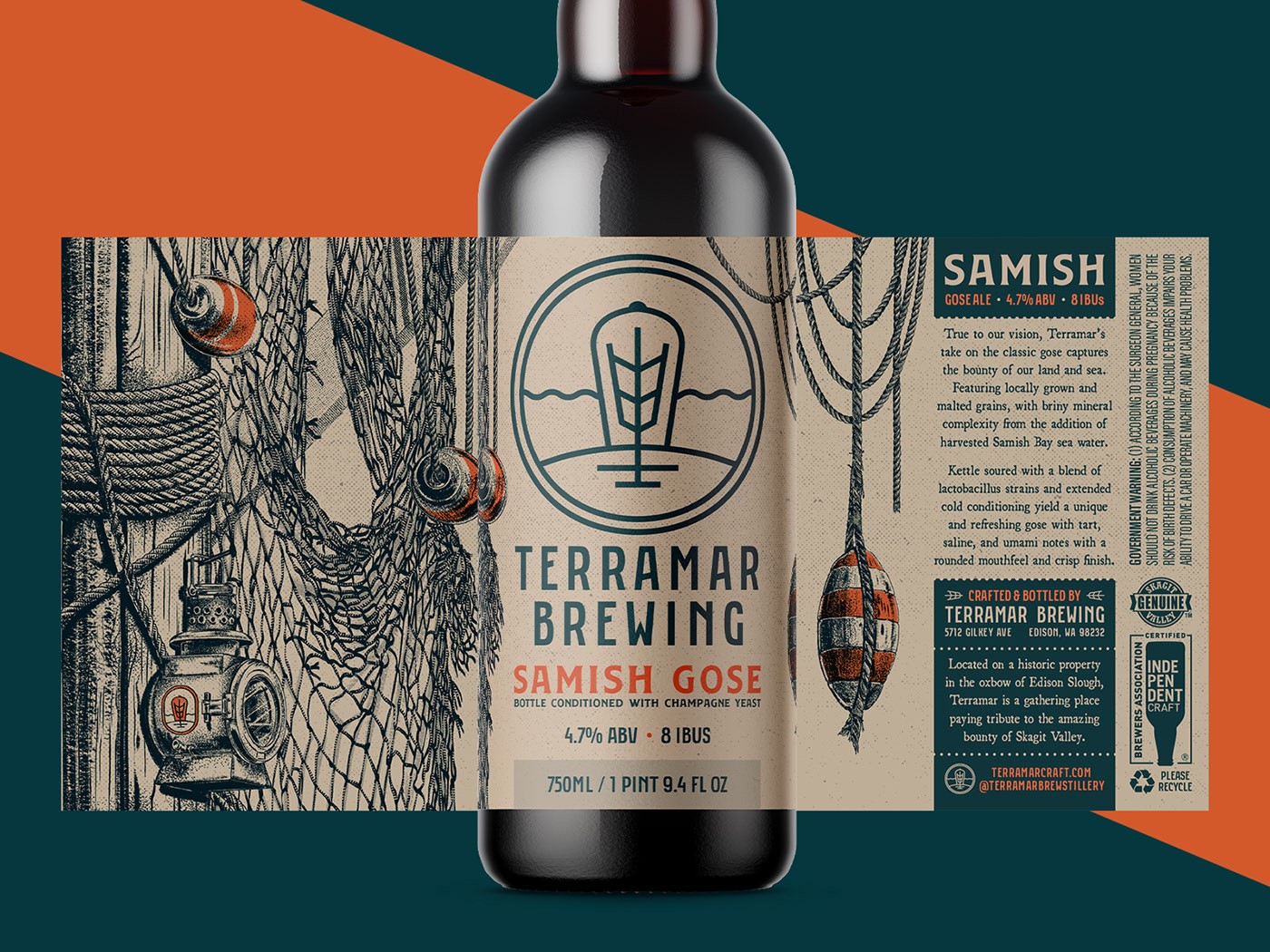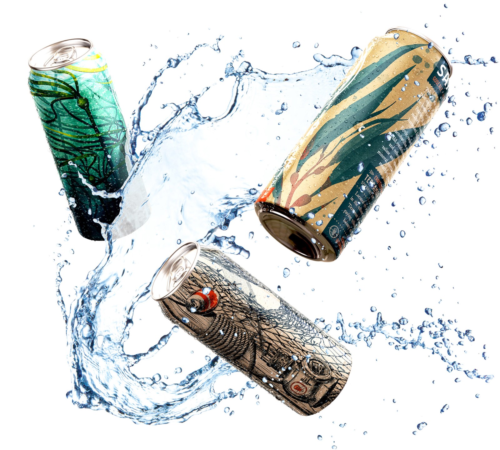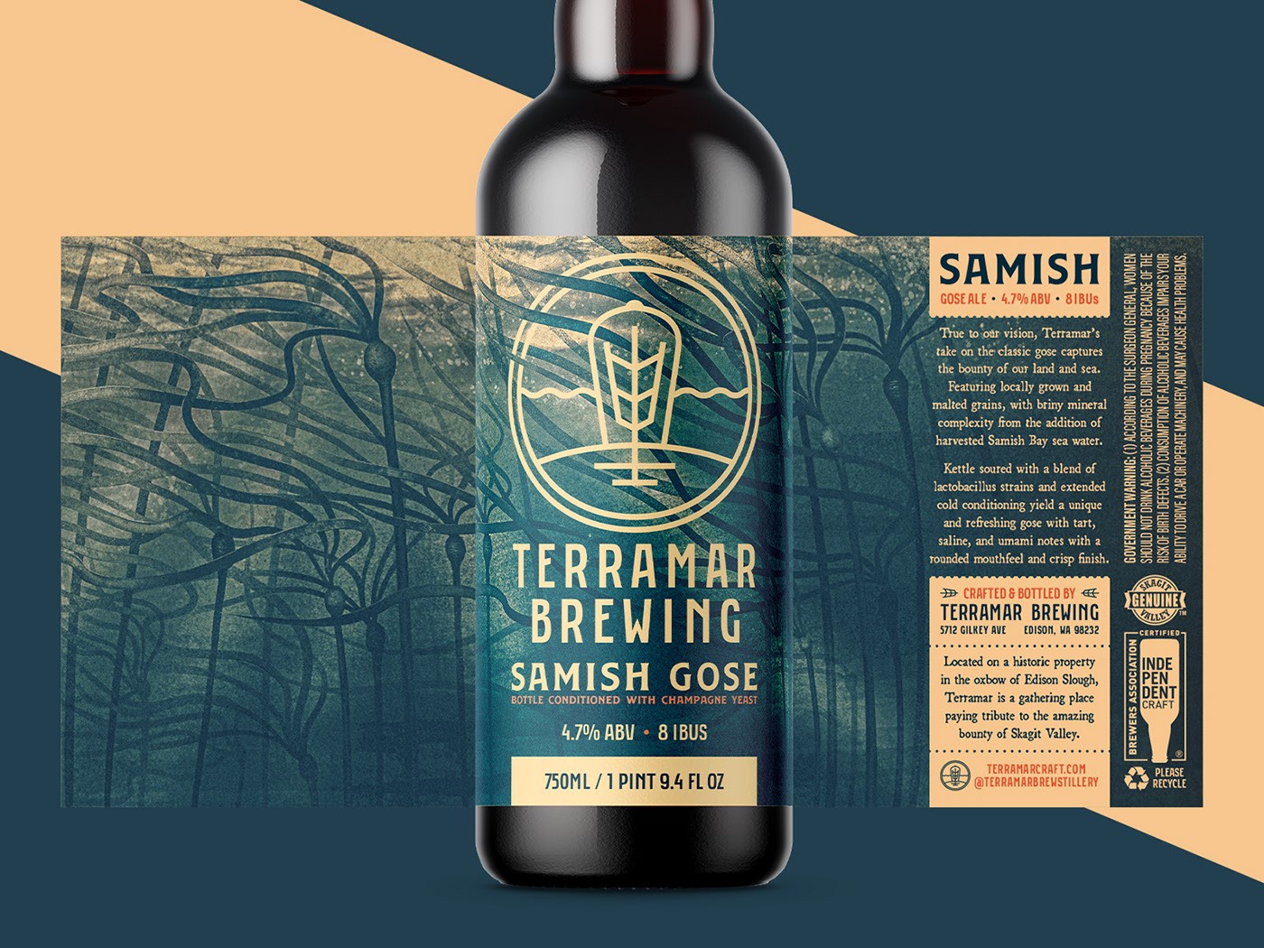 Terramar 的 Samish Gose,一個 750 毫升的瓶子,看看這些設計如何轉(zhuǎn)化為 16 盎司的罐子,以水彩風格的巨型海帶(sp. Macrocystis pyrifera)的繪畫效果圖為中心