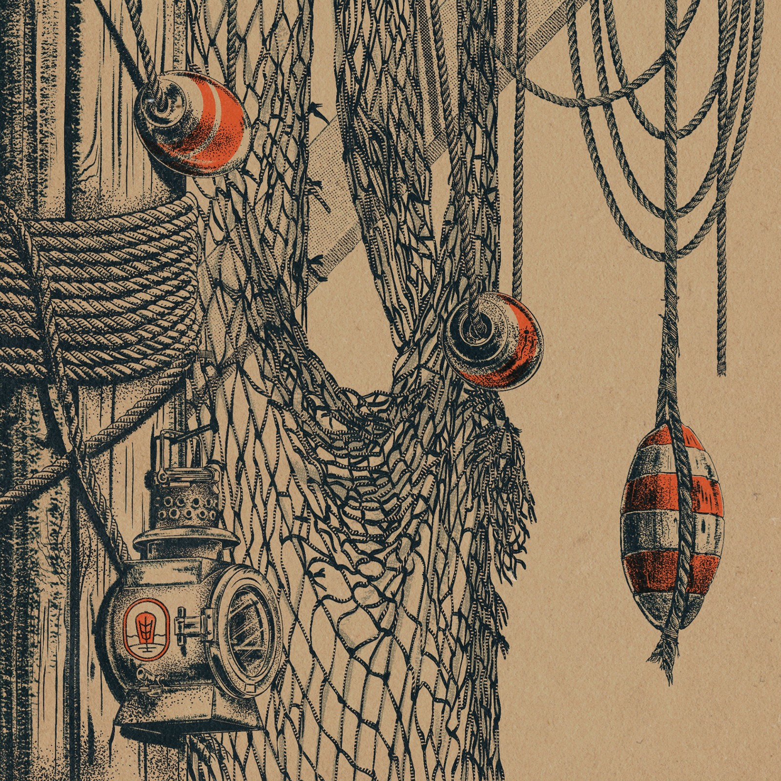 這個概念結合了漁船索具、燈籠、浮標和漁網(wǎng)的插圖圖像。