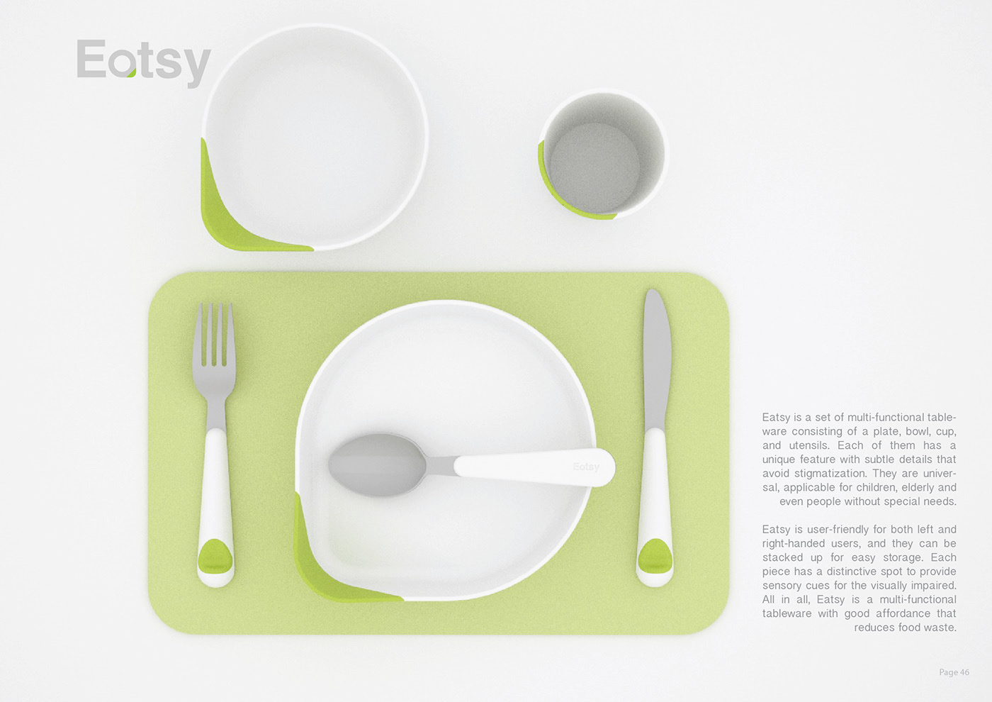 Eatsy 是一套多功能餐具,由盤子、碗、杯子和餐具組成。他們每個人都有一個獨(dú)特的功能,帶有微妙的細(xì)節(jié),可以避免污名化。它們是通用的,適用于兒童、老人甚至沒有特殊需要的人。Eatsy 對慣用左手和慣用右手的用戶都非常友好,它們可以疊放起來以便于存放。