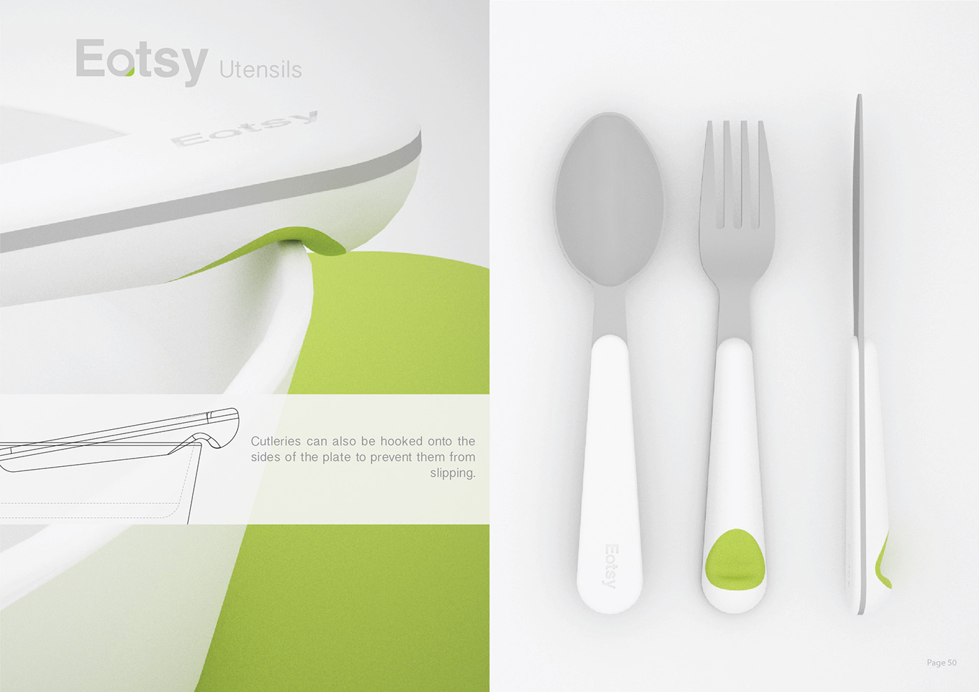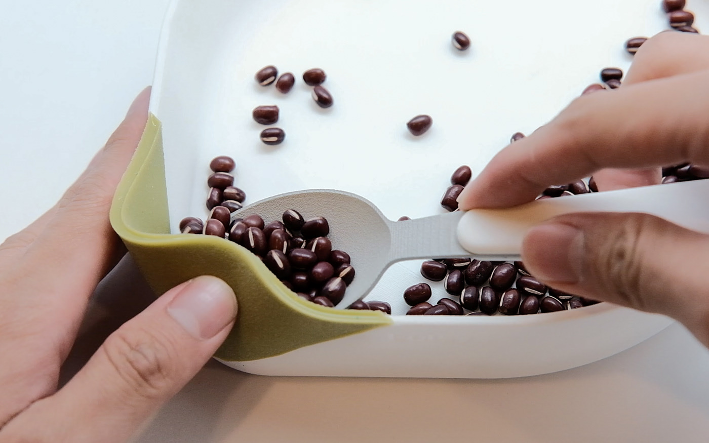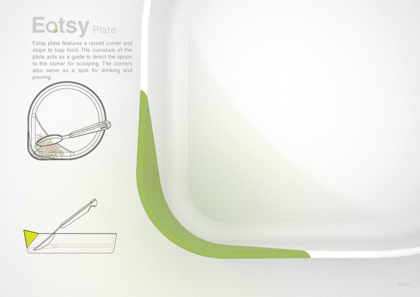 Eatsy 盤子的特點(diǎn)是有一個凸起的角落和斜坡來夾住食物。盤子的曲率作為引導(dǎo),將勺子引導(dǎo)到角落進(jìn)行舀。角落也可以作為飲用和傾倒的地方。